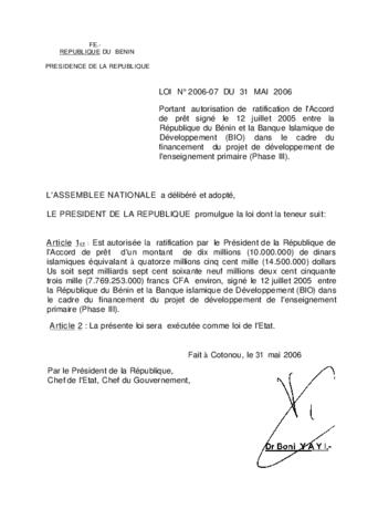 portant autorisation de ratification de l'accord de prêt signé le 12 juillet 2005 entre la République du Bénin et la Banque Islamique de Développement...