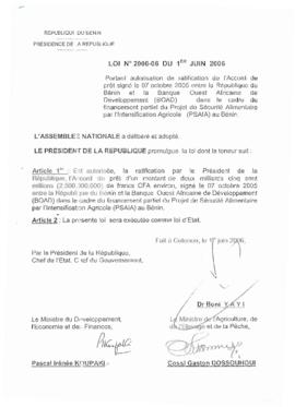 portant autorisation de ratification de l'Accord de prêt signé le 07 Octobre 2005 entre la République du Bénin et la Banque Ouest Africaine de Dévelop...