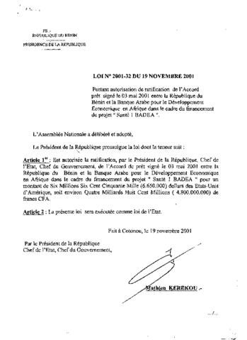 portant autorisation de ratification de l'Accord prêt signé le 03 mai 2001 entre la République du Bénin et la Banque Arabe pour le Développement Écono...