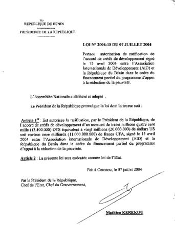 portant autorisation de ratification de l'accord de crédit de développement signé le 15 avril 2004 entre l'Association Internationale de Développement...