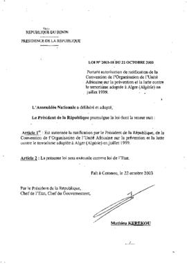 portant autorisation de ratification de la Convention de l'Organisation de l'Unité Africaine sur la prévention et la lutte contre le terrorisme adopté...