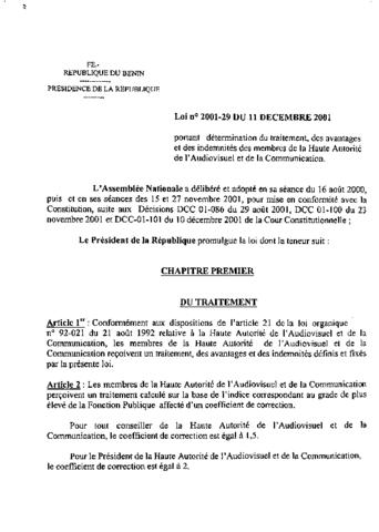 LOI N°2001-29 du 11 Décembre 2001