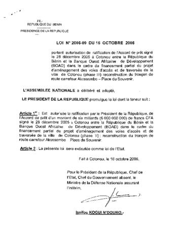 portant autorisation de ratification du l'Accord de prêt signé le 28 Décembre 2005 à Cotonou entre la République du Bénin et la Banque Ouest Africain...