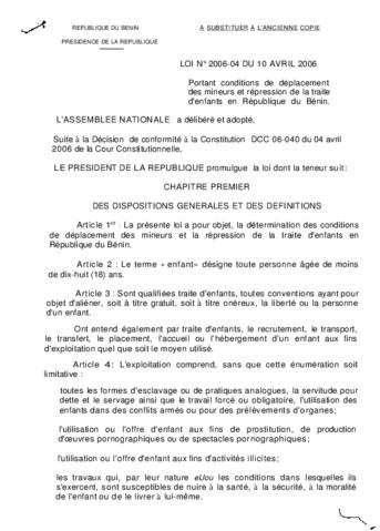 portant conditions de déplacement des mineurs et répression de la traite d'enfants en République du Bénin.
