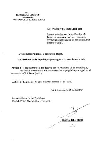portant autorisation de ratification du traité international sur les ressources phylogénétiques signé le 03 novembre 2001 à Rome (Italie)