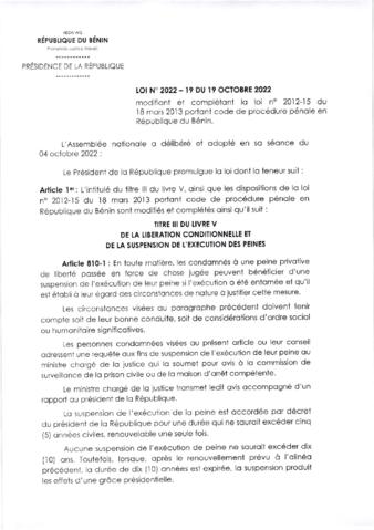 LOI N°2022-19 DU 19 OCTOBRE 2022
