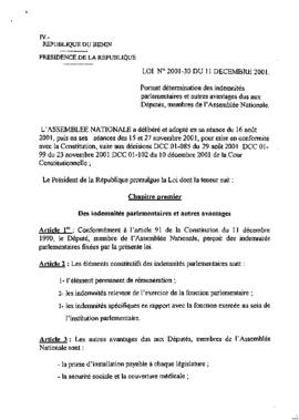 Portant détermination des indemnités parlementaire set autres avantages dus aux Députés, membres de l'Assemblée Nationale