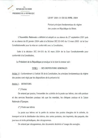 portant principes fondamentaux du régime des postes en République du Bénin.