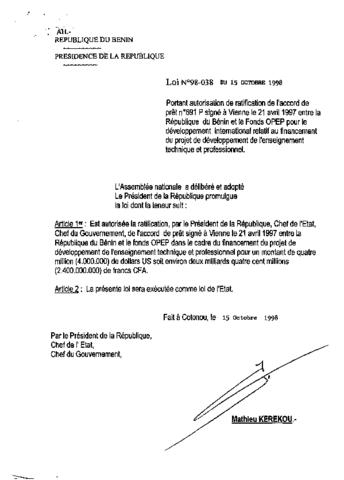 Loi portant autorisation de ratification de l’accord de prêt n° 691 P signé à Vienne le 21 avril 1997 entre la République du Bénin et le Fonds OPEP po...