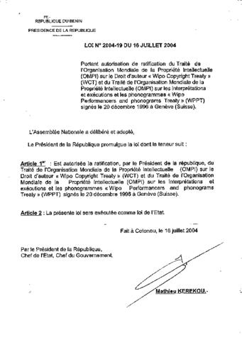 portant autorisation de ratification des traités de l’organisation mondiale de la propriété intellectuelle (OMPI) sur le droit d’auteur Wipo Copyright...