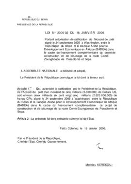 portant autorisation de ratification de l'Accord de prêt signé le 24 septembre 2005 à Washington, entre la République du Bénin et la Banque Arabe pour...