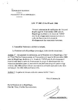 portant autorisation de ratification de l’accord de prêt signé le 10 novembre 2000 entre la République du Bénin et le Fonds OPEP pour le développement...