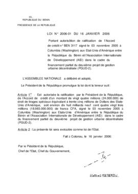 portant autorisation de ratification de l'Accord de crédit n° BEN 3117 signé le 03 novembre 2005 à Columbia (Washington) aux Etats-Unis d'Amérique ent...