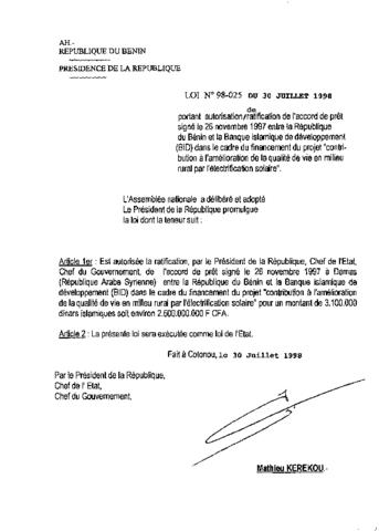 portant autorisation de ratification de l'accord de prêt signé le 26 novembre 1997 entre la République du Bénin et la Banque islamique de développemen...