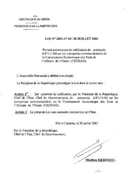 LOI N°2001-17 DU 20 JUILLET 2001