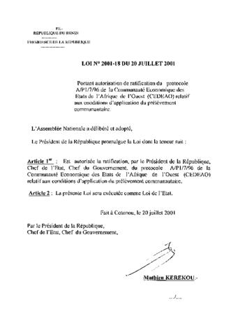 portant autorisation de ratification du protocole A/P1/7/96 de la communauté Economique des Etats de l'Afrique de l'Ouest (CEDEAO) relatif aux conditi...