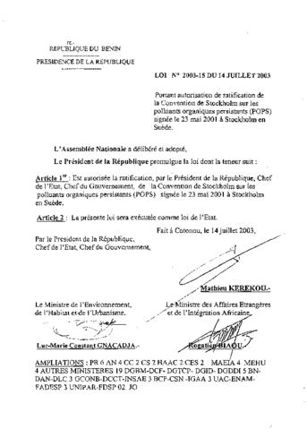 portant autorisation de ratification de la Convention de Stockholm sur les polluants organiques persistants (POPS) signée le 23 mai 2001 à Stockholm e...