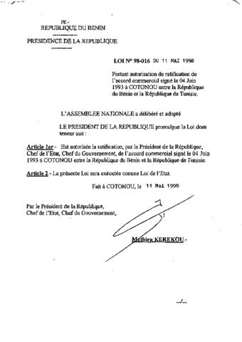 portant autorisation de ratification de l'accord commercial signé le 04 Juin 1993 à cotonou entre la république du bénin et la république de tunisie.
