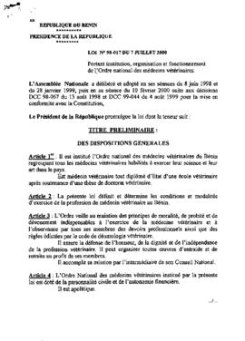 portant institution, organisation et fonctionnement de l'Ordre national des médecins vétérinaires