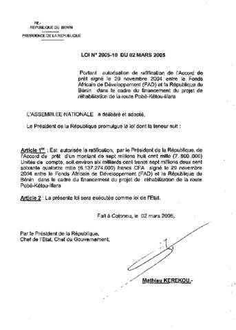 portant autorisation de ratification de l'accord de prêt signé le 29 novembre 2004 entre le fonds Africain de développemnt (FAD) et la république du B...