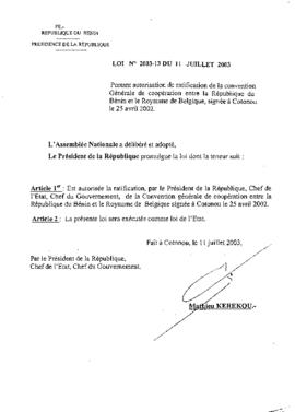 portant autorisation de ratification de la convention Générale de coopération entre la République du Bénin et le Royaume de Belgique, signée à Cotonou...