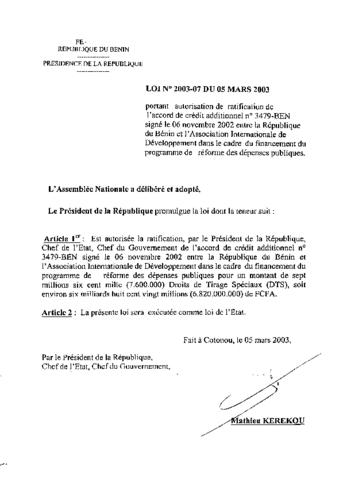 portant autorisation de ratification de l'accord de crédit additionnel n° 3479-BEN signé le 06 novembre 2002 entre la République du Bénin et l 'Associ...