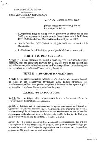 portant exercice du droit de grève en République du Bénin