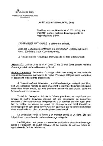 modifiant et complétant la loi n°2001-07 du 09 mai 2001 portant maîtrise d'ouvrage public en République du Bénin