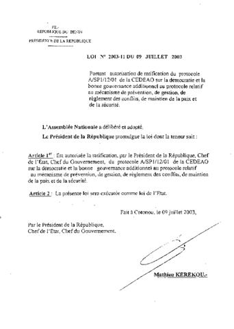 portant autorisation de ratification du protocole A/SP1/12/01 de la CEDEAO sur la démocratie et la bonne gouvernance additionnel au protocole relatif...