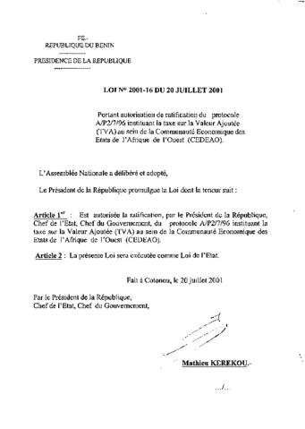 portant autorisation de ratification du protocole A/P2/7/96 instituant la taxe sur la Valeur Ajoutée (TVA) au sein de la Communauté Economique des Eta...