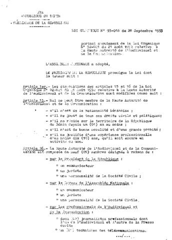 LOI ORGANIQUE N°93-018 du 26 Septembre 1993