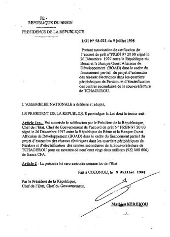portant autorisation de ratification de l'accord de prêt n° PR BN 97 20 00 signé le 26 Décembre 1997 entre la République du Bénin et la Banque Ouest A...