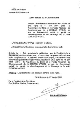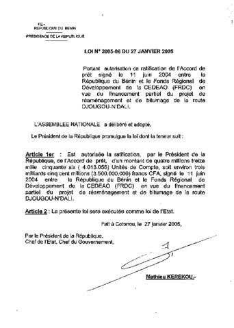 Portant autorisation de ratification de l’accord de prêt signé le 11 juin 2004 entre la République du Bénin et le Fonds Régional de Développement de l...