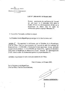portant autorisation de ratification de l’accord de prêt signé le 23 décembre 2002 entre le Fonds Africain de Développement (FAD) et la République du...