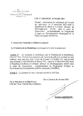 Portant autorisation de ratification de l'accord de prêt signé le 23 décembre 2002 entre la République du Bénin et le Fonds Africain de Développement...