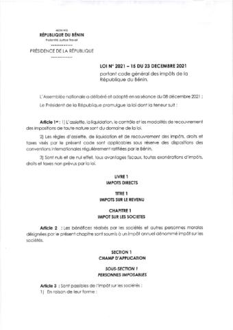 portant code général des impôts de la République du Bénin