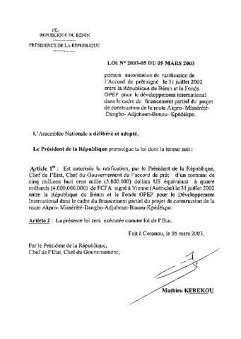 portant autorisation de ratification de l’accord de prêt signé le 31 juillet 2002 entre la République du Bénin et le Fonds OPEP pour le développement...