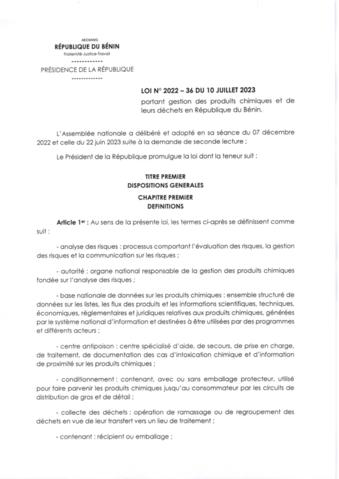 portant gestion des produits chimiques et de leurs déchets en République du Bénin
