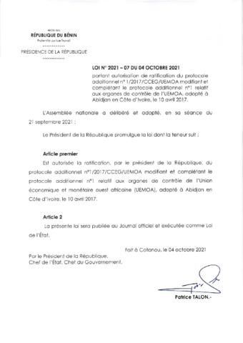 portant autorisation de ratification du protocole additionnel n°1/2017/CCEG/UEMOA modifiant et complétant le protocole additionnel n°1 relatif aux org...