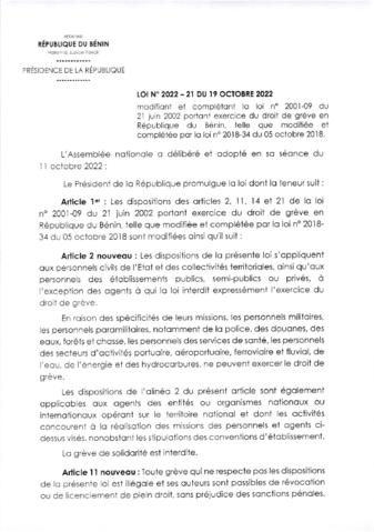 modifiant et complétant la loi n° 2001-09 du 21 juin 2002 portant exercice du droit de grêve en République du Bénin. Telle que modifiée et complétée p...