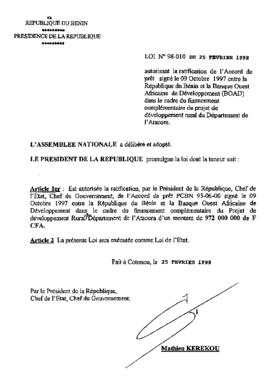 autorisant la ratification de l'Accord de prêt signé le 09 Octobre 1997 entre la République du Bénin et la Banque Ouest Africaine de Développement (BO...