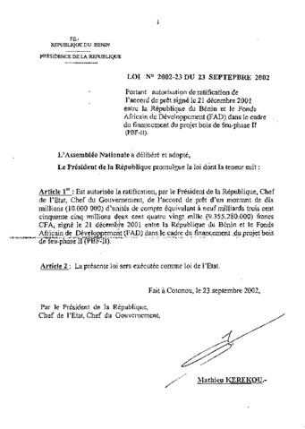 portant autorisation de ratification de l'accord de prêt signé le 21 décembre 2001 entre la République du Bénin et le Fonde Africain de Développement...