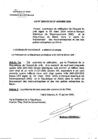 Portant autorisation de ratification de l’accord de prêt signé le 03 mars 2004 entre la Banque Islamique de Développement (BID) et la République du Bé...
