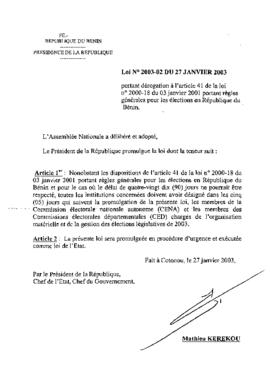 portant dérogation à l'article 41 de la loi N°2001-18 du 03 Janvier 2001 portant règles générales pour les élections en République du Bénin