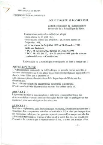 portant organisation de l'administration territoriale de la République du Bénin