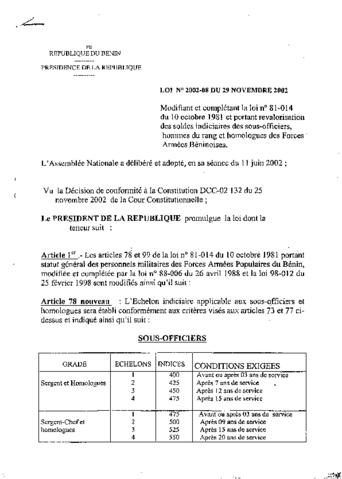 modifiant et complétant la loi n° 81-014 du 10 octobre 1981 et portant revalorisation des soldes indiciaires des sous-officiers, hommes du rang et hom...