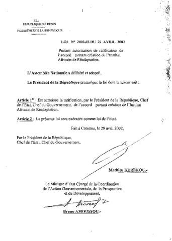 portant autorisation de ratification de l'accord portant création de l'institut Africain de réadaptation