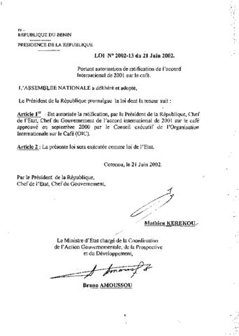 portant autorisation de ratification de l'accord international de 2001 sur le café