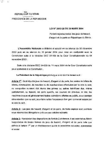 portant réglementation des jeux de hasard, d’argent et de paris en République du Bénin.
