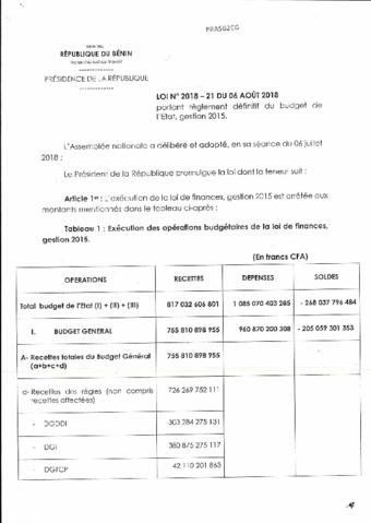 portant règlement définitif du budget de l'Etat , gestion 2015